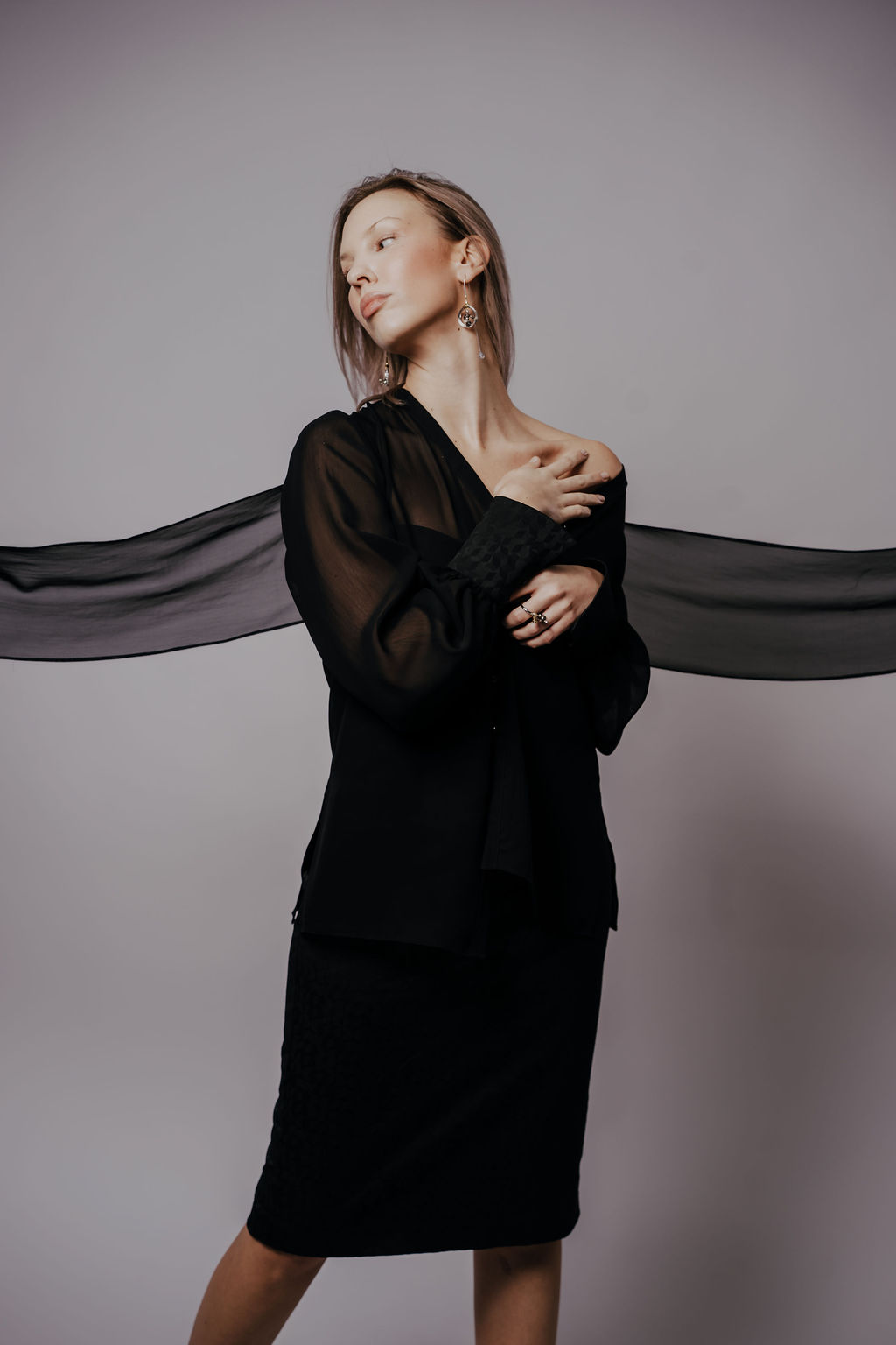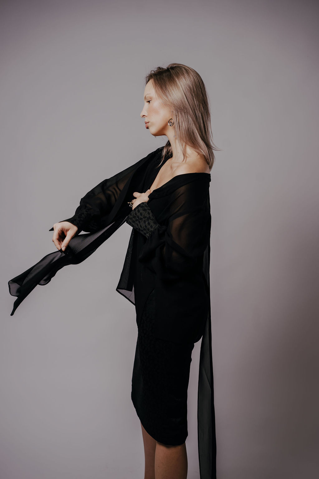 Crna lepršava košulja od muslin svile, lagane i prozračne teksture. Klasičan, ali fluidan kroj omi+ogučava razne stilizacije , dok suptilna elegancija materijala ističe ženstvenost i sofisticiranost. Idealna u kombinaciji sa širokim hlačama ili klasičnom suknjom iz TYCHE kolekcije.